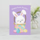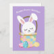 Customise this cute Happy Easter Bunny card with your own personalised text with your child's name in white script. This adorable bunny rabbit sits in a pretty Easter basket on a lovely purple card for children.