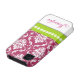 Hot Pink White Damask iPhone 4 Case-Mate Tough Case with a line of diamonds printed on a lime green band and pink text for your name. Elke Clarke©