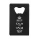 Personalised keep calm and your text bottle opener. Credit card size. Vintage keepcalmandcarryon typography design with little crown. Make your own funny keep calm and carry on parody. Keepcalm and drink beer. Keep calm and party on. Black and white or custom background colour. Humourous gift idea for men and women.