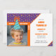 Celebrate your little one's birthday with a festive custom purple invitation card that features a fun display of orange and yellow stars and circles. Personalise this bright design with a photo of your little birthday boy or girl, complete with a cheerful blue birthday hat.