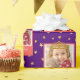 Wrap your gifts in a royal custom purple wrapping paper that features an elegant background of gold shimmery stars. Personalise this bright design with a photo of your young birthday girl, complete with a beautiful gold princess crown.