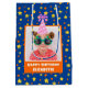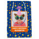 Wrap your gifts in a festive custom blue gift bag that features a fun display of orange and yellow stars and circles. Personalise this bright design with a photo of your little birthday boy or girl, complete with a cheerful pink birthday hat.
