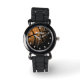 Personalised kid's watch with basketball design. Personalised wrist watches for children. Unique Birthday gift idea for sporty boys and girls. Create one for son, grandson, nephew, little brother, sibling, cousin, friend, child, grandchild, daughter etc. Also great as Christmas present for the Holidays. Includes black colour rubber silicone band. Orange or custom colour ball. Background colour can be changed.