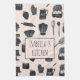 cute illustrated baker or cook kitchen towels with cute kitchen essentials on a dotted pink background. Rolling pin, whisk, eggs, mixing bowls, and more.