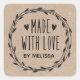 A personalised "made with love" sticker on a kraft coloured background surrounded by a laurel wreath. Make it yours by adding your own name. A pretty finishing touch for all of your handmade gifts. Designed for you by Blackberry Boulevard.