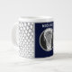 Unique lacrosse mug featuring lax stick, mesh and ball on navy blue background. Edit text to add name.