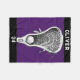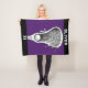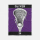 Lacrosse player or coach blanket featuring stick-and-ball design on purple background. To personalise edit text to add lax player's name and team number #.