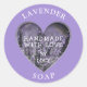 Custom sticker features lavender background behind a cutout love heart frame with the words "Lavender Soap, Handmade with love". All text is customisable.