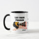 Personalised LET YOUR PRAISES ROAR Christian coffee mug, based on the Bible verse from Psalm 47:1 - 'Shout unto God with the voice of triumph'. The design shows the roaring head of a lion, and the wording LET YOUR PRAISES ROAR. In the background are musical staves. The main colour scheme is red, yellow, black and white. The design is repeated front and back and in between, I've put the Scripture verse for Psalm 47:1 which is CUSTOMIZABLE so you can add your name, the name of your worship band or team, your favourite Bible verse or create your own text. on the front/back bottom right, there is a CUSTOMIZABLE NAME (see what I did there?) which you can also change for your name. Or you can simply delete this text. This would be a great gift to any Christian who loves to warfare in praise and worship.