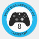 Gamer themed birthday party stickers to seal party favours or birthday invitation envelopes. Blue personalised levelled up.
