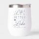 Celebrate life at your seaside abode with this cute personalised wine tumbler featuring the phrase "life is better at the lake" in navy blue lettering accented with an anchor and an oar. Customise with your family name and/or year established beneath.