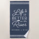 Upgrade your outdoor setup at your riverside abode with this cute personalised beach towel featuring the phrase "life is better on the river" in white lettering accented with an anchor and an oar. Personalise with your family name and/or year established beneath. Great for housewarmings, summer homes, or vacation rentals.