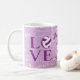 Cute personalised love netball design, with painted lve letters and netball for the O, background is pink with various netball positions, terms and netball related themes in the background in white.