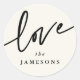 Round sticker/envelope seal with the word 'love' in a handwritten script font. The rest of the text is completely customisable - so the font style, size, colour and placement can be changed. The background colour can also be changed using Zazzle's editing tools. This design is available in different colours and on other sticker shapes/sizes in my store.