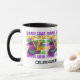 Stylish Personalised MARDI GRAS Top Hat Feathers Coffee Mug with CUSTOMIZABLE TEXT. The design shows a large top hat with Mardi Gras feathers. The phrase MARDI GRAS is repeated in the popular colours of purple, gold and green in the background in bold typography. Ideal Mardi Gras gift to celebrate Fat Tuesday in Louisiana, Brazil and wherever Mardi Gras is celebrated. Matching clothing and gifts available.