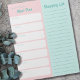 Pastel Pink and Blue Notepad for your weekly meal planning and shopping lists. That said, the template is set up for you to edit the headings, so please feel free to change Meal Plan and Shopping List to Appointments and To Do List, for example. The notepad is printed on every page, so you can tear off your list and take it to the grocery store. This design has a colour palette of pastel pink and aqua blue with white boxes and light teal typography.