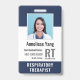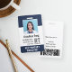 Personalise these vertical medical personnel badges with an employee photo and name, along with multiple custom text fields for hospital or healthcare facility name, unit or floor, title abbreviation, employee ID number, and valid through date. The title or role appears along the bottom in bold white lettering for easy identification. Customise with a barcode on the back if needed, along with return information or other details.