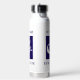 Personalised mermaid Beach House water bottle. Mermaid illustration with contemporary block text at top and bottom. Blue and white.