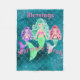 Cute personalised mermaid fleece blanket with three mermaids long hair purple, teal, hot pink in a teal background. Option to personalised the text is available. Design © by Nayda Liz Rivera