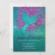 Personalised Mermaid Themed Birthday Party Invitation in Purple Glitter and a Teal Ocean Backdrop.