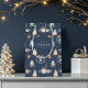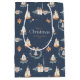 Celebrate the season in style with this elegant personalised Christmas gift bag. Featuring a festive watercolor pattern of candles, ornaments, wreaths, and gifts on a navy blue background. Perfect for wrapping presents, party favours, or corporate gifting.