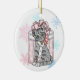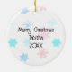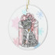 Adorable hand drawn grey kitty cat with a pink bow on with snowflakes background. Personalise this ornament on the back.