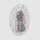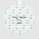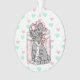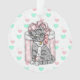 Adorable hand drawn grey kitty cat with a pink bow on with mint green and pink heart background. Personalise this ornament on the back.