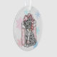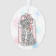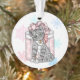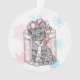 Adorable hand drawn grey kitty cat with a pink bow on with snowflakes background. Personalise this ornament on the back.