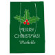 Personalised Merry Christmas holly leaves gift bag. Cute Holiday symbol design for men women and kids. Green and red colours. Personalised Xmas greeting / wishes. Add your own name. Elegant design. Also nice for corporate party favours in business or company office. Make them for employees and coworkers.