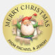 A jolly Santa appears to burst out of this sticker to wish all a Merry Christmas. Add your name(s) in place of the sample names shown for a custom sticker this holiday season. The sticker comes in 2 sizes: a smaller 1 1/2 inch size and a 3 inch size. Choose the size that suits your project, whether it be for Christmas card seals, party favours, gift packages or other.