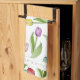 The product design features a pattern of colourful tulip flowers in purple, red, pink, blue, and yellow. This botanical illustration with personalised text makes a modern and unique kitchen towel - Gift idea for Easter, Mother’s Day, and more!