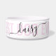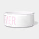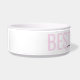 Pink, black, and white dog bowl with grey "BEST DOG EVER" and your dog's name customised in a chic and elegant calligraphy script font text overlay. Enter any personalised text you like for the background and top layer of text to create your own pink personalised modern and minimal and fun ceramic pet food or water bowl. See our collection of coordinating bowls and get a set!