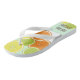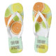 This design features a pattern of summer citrus fruit slices: orange, lemon, and lime. The original food illustration with personalised text makes modern and unique flip flops.