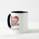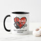 Personalised Modern Skeleton Hand Peace and Love Valentine's Day Mug - Celebrate Valentine's Day with a fun, spooky twist with this skeleton hand making a peace sign with a red heart, Peace and Love in a distressed retro font. Perfect for Halloween enthusiasts and lovers of all things spooky and scary. Perfect for birthdays and anniversaries too. Customise the text and add your name.