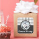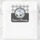 The design features a pair of ice skates over a snowflake crest and an off-white tartan pattern background. This elegant winter sports design serves as cute modern and unique square stickers with personalised text.