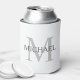features personalised name in grey and monogram in light grey as background, in classic serif font style,