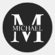 featuring personalised white monogram in classic serif font style with box of name in the middle of monogram on black background.
