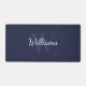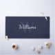 features personalised name in white script font style and monogram in light navy blue serif font style as background, on navy blue background.