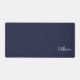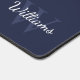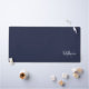features personalised name in white script font style and monogram in light navy blue serif font style as background, on navy blue background.