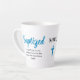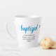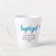Simple, stylish personalised BAPTISM latte mug, with CUSTOMIZABLE MONOGRAM and personal message. The design reads BAPTIZED in mid cyan blue script typography, followed by IN THE NAME OF THE FATHER AND OF THE SON AND OF THE HOLY SPIRIT AMEN, which is based on Matthew 28:19 from the Bible. BAPTIZED is also customisable, so you can change to the British spelling of BAPTISED. The lines of text can also be replaced with your name and date of baptism. This would make a great adult baptism gift for all who have recently walked through the waters of baptism. Also available as coffee mug in other colours.