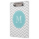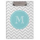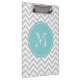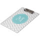 Personalised monogram clipboard with grey chevron pattern. Custom background colour with turquoise label. Create your own with your name initial letter. Elegant zigzag stripe design.