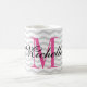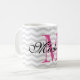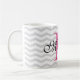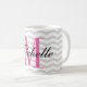 Personalised monogram grey chevron pattern mug. Cute monogrammed coffee mug design with trendy grey zig zag stripes. Cute typography Birthday or wedding favour gift idea for men, women, friends and family. Stylish zigzag design with elegant script typography. Custom colour for name initial letter. ie neon pink. Unique coffeemugs also available as large oversized cups and big to go travel mugs