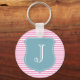 Personalised monogram keychain | initial J letter. Elegant initial letter with customisable background colour. Cute gift idea for women and girls. Pink stripe pattern with turquoise emblem shield.