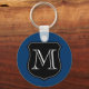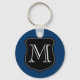 Personalised monogram keychain with letter emblem shield. Elegant initial letter with customisable dark blue background colour. Cool gift idea for men and boys.