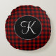 Single Script Monogram Red and Black Buffalo Plaid Round pillow