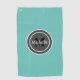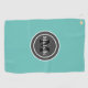 Teal background with grey and white circle centred on towel with last name initial in black and first name in white
