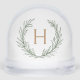 Elegant personalised photo snow globe features a portrait of your family on the front with a leafy botanical wreath or crest design with two intersecting laurel branches. Personalise the classic serif monogram letter with your family's last name initial. The green, white and tan gold colour scheme can be modified to coordinate with your photo or home decor.