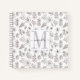 An elegant delicate white and black hand drawn style botanical with flowers and leaves and your monogrammed name in pale pastel lavender and black, with a modern script typography on a banner with your initial. A stylish earthy notebook for everyday use.