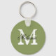 Personalised moss green custom name monogram keychain. Vintage initial letter with elegant script typography. Cute party favour key chain gift idea. Make your own monogrammed present for stylish wedding, bridal shower, bachelorette, girl's weekend, engagement, anniversary etc. Fun for bride to be, bridesmaid, maid of honour, flower girl, mother of the bride, mother of the groom etc. Olive green and white.
