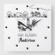 This black and white Mr. & Mrs. clock features two chickens, a rooster and hen in love. They are set against a charming line drawing country farm. It can be personalised with a surname or any text that you wish to add. ~